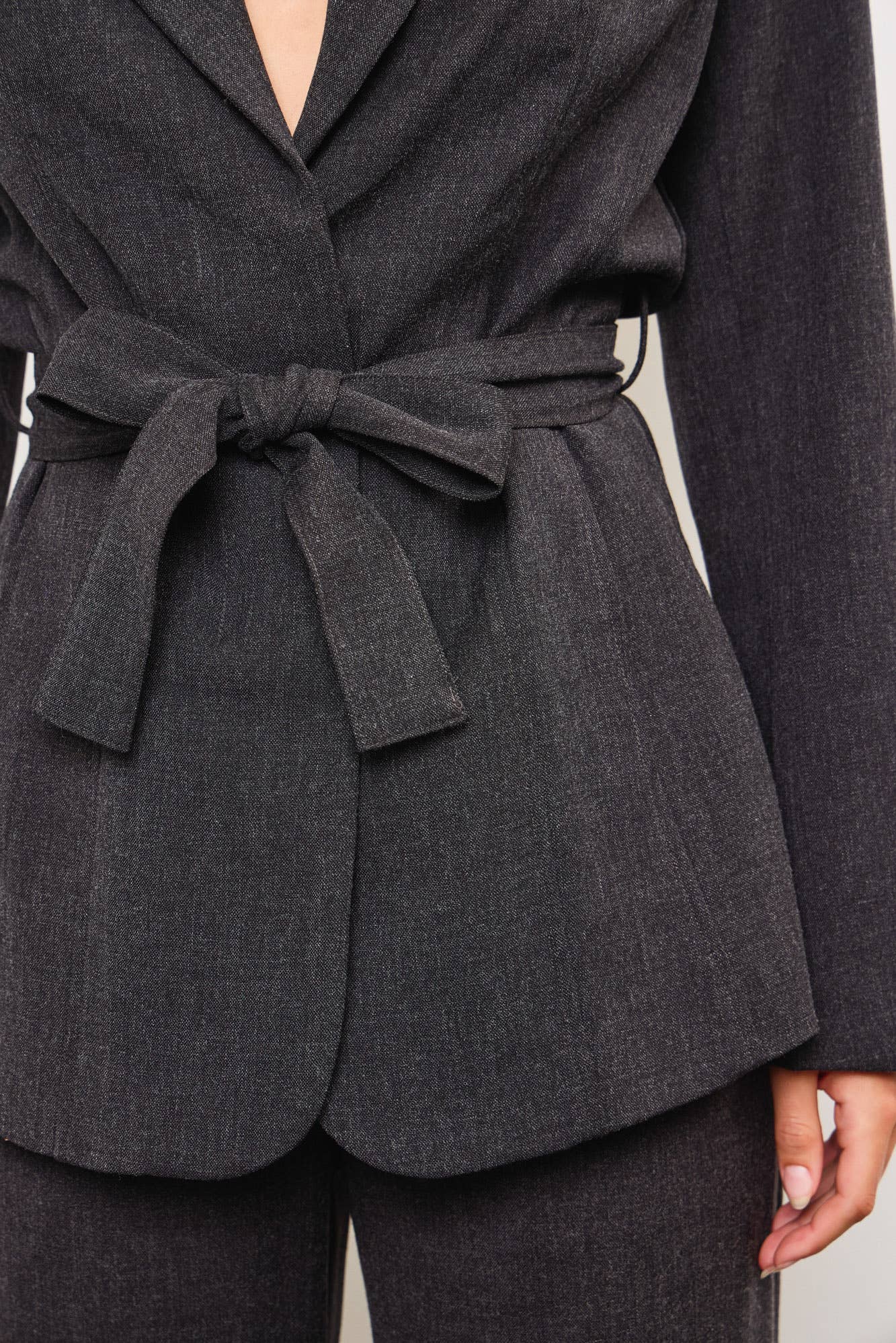 Fitted blazer with adjustable waist and open collar. Structured shoulders and hits past the waist. Charcoal color.