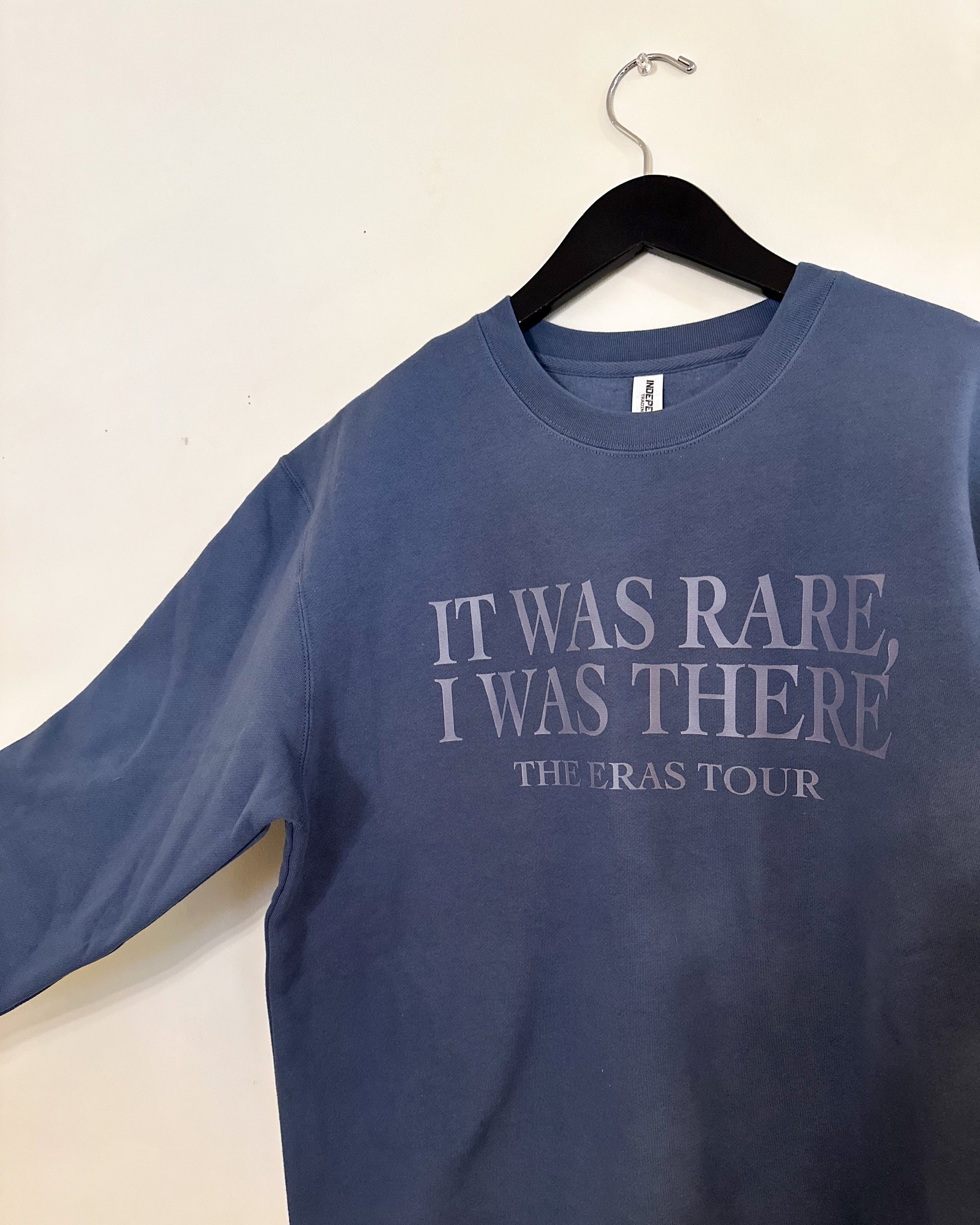 Slate blue sweatshirt with eras tour font that says "It was Rare, I Was There"
