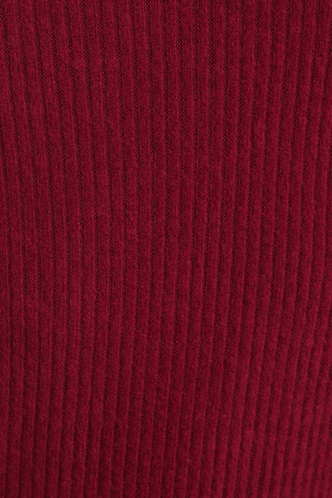 Long sleeve wine colored wrap dress with front waist tie on one side. Tie is adjustable and neckline is like a boat neck. Sweater like material.