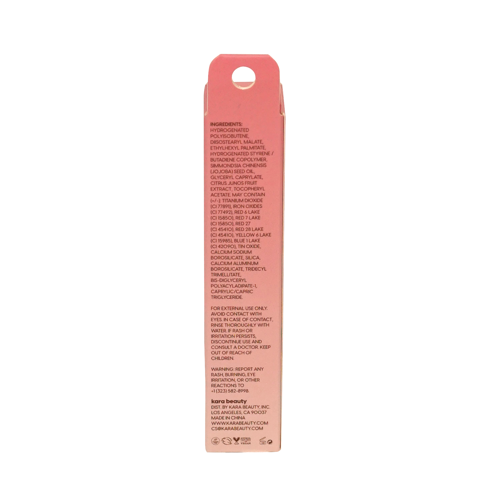 ingredients: Hydrogenated Polyisobutene, Hydrogenated Styrene/Butadiene Copolymer, Diisostearyl Malate, Ethylhexyl Palmitate, Simmondsia Chinensis (Jojoba) Seed Oil, Glyceryl Caprylate, Citrus Junos Fruit Extract, Tocopheryl Acetate, D&C Red 27 (CI 45410), Calcium Sodium Borosilicate, Titanium Dioxide (CI 77891), Tin Oxide, Caprylic/Capric Triglyceride, Calcium Aluminum Borosilicate, Tridecyl Trimellitate, FD&C Blue 1 Al Lake (CI 42090), D&C Red 28 Al Lake (CI 45410), Bis-Diglyceryl Polyacyladipate-1, FD&C Yellow 6 Al Lake (CI 15985), D&C Red 6 Ba Lake (CI 15850), Synthetic Fluorphlogopite.