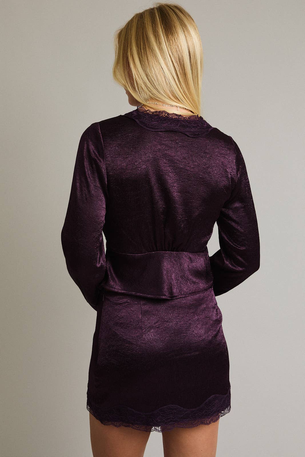 Satin skirt with lace trim in a dark purple color. Flared and mini length.