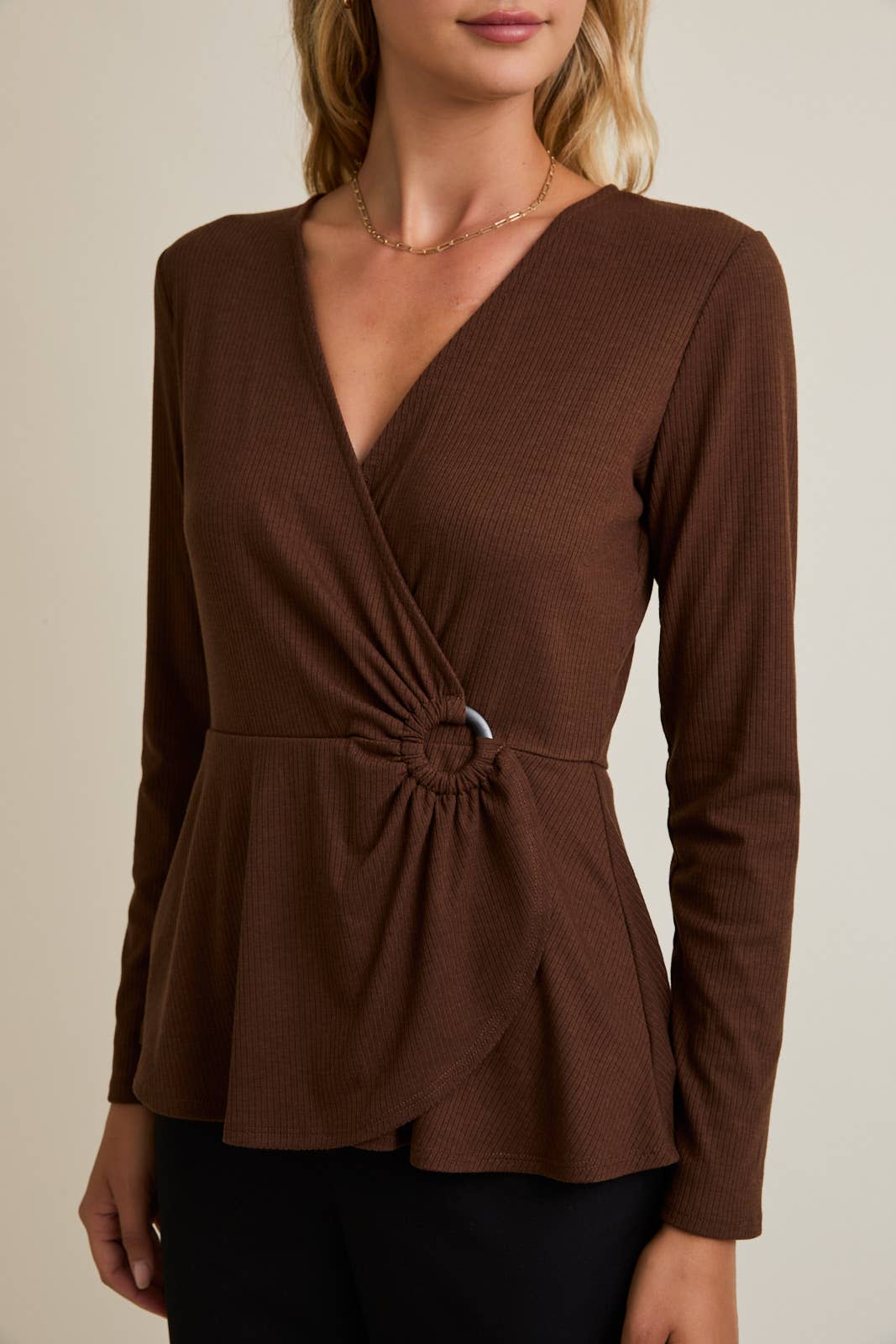 Surplice long sleeve brown top with long sleeves and slightly flare hem. O-ring on waist to cinch at the waist. Sweater like fabric.